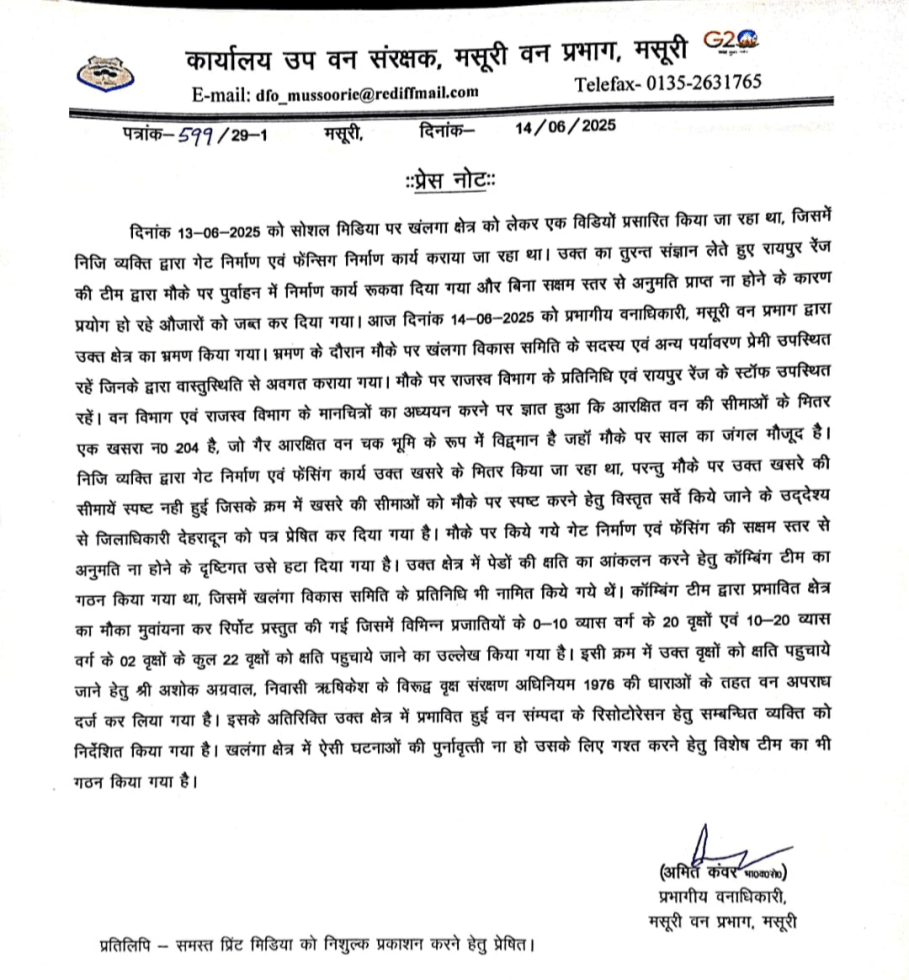 मौके पर किये गये गेट निर्माण एवं फेंसिंग की सक्षम स्तर से अनुमति ना होने के दृष्टिगत उसे हटा दिया गया है। उक्त क्षेत्र में पेडों की क्षति का आंकलन करने हेतु कॉम्बिंग टीम का गठन किया गया था, जिसमें खलंगा विकास समिति के प्रतिनिधि भी नामित किये गये थे।