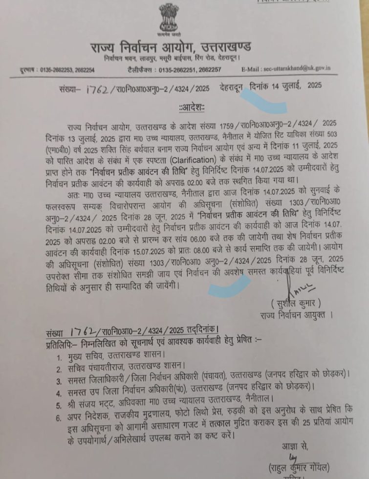राज्य निर्वाचन आयोग, उत्तराखण्ड के आदेश संख्या 1759/रा०नि०आ०अनु०-2/4324/2025 दिनांक 13 जुलाई, 2025 द्वारा मा० उच्च न्यायालय, उत्तराखण्ड, नैनीताल में योजित रिट याचिका संख्या 503 (एम०बी०) वर्ष 2025 शक्ति सिंह बर्थवाल बनाम राज्य निर्वाचन आयोग एवं अन्य में दिनांक 11 जुलाई, 2025 को पारित आदेश के संबंध में एक स्पष्टता (Clarification) के संबंध में मा० उच्च न्यायालय के आदेश प्राप्त होने तक ‘निर्वाचन प्रतीक आवंटन की तिथि हेतु विनिर्दिष्ट दिनांक 14.07.2025 को उम्मीदवारों हेतु निर्वाचन प्रतीक आवंटन की कार्यवाही को अपराह्न 02.00 बजे तक स्थगित किया गया था।