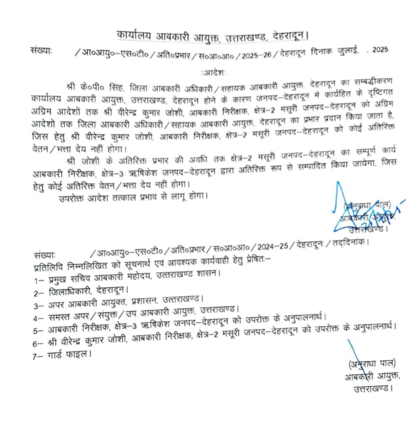 श्री के०पी० सिंह, जिला आबकारी अधिकारी / सहायक आबकारी आयुक्त, देहरादून का सम्बद्धीकरण कार्यालय आबकारी आयुक्त, उत्तराखण्ड, देहरादून होने के कारण जनपद-देहरादून में कार्यहित के दृष्टिगत अग्रिम आदेशों तक श्री वीरेन्द्र कुमार जोशी, आबकारी निरीक्षक, क्षेत्र-2 मसूरी जनपद-देहरादून को अग्रिम आदेशों तक जिला आबकारी अधिकारी / सहायक आबकारी आयुक्त, देहरादून का प्रभार प्रदान किया जाता है, जिस हेतु श्री वीरेन्द्र कुमार जोशी, आबकारी निरीक्षक, क्षेत्र-2 मसूरी जनपद-देहरादून को कोई अतिरिक्त वेतन/भत्ता देय नहीं होगा।
