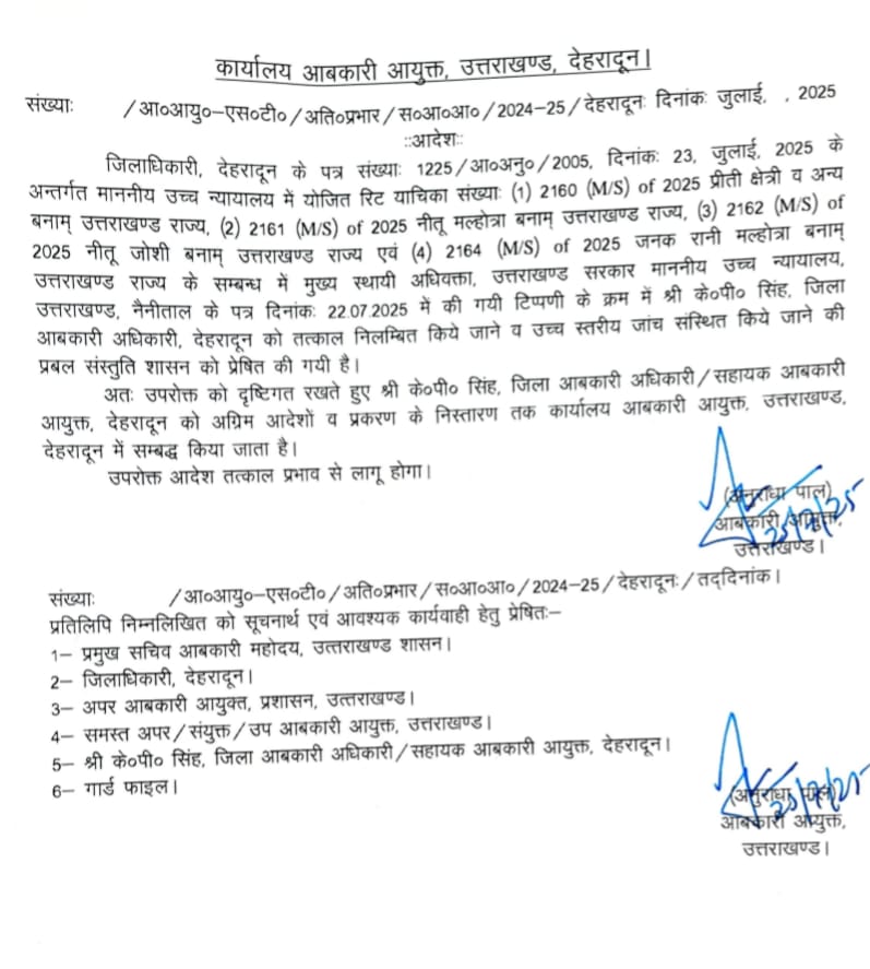 जिलाधिकारी, देहरादून के पत्र संख्याः 1225/आ०अनु०/2005, दिनांकः 23, जुलाई, 2025 के अन्तर्गत माननीय उच्च न्यायालय में योजित रिट याचिका संख्याः (1) 2160 (M/S) of 2025 प्रीती क्षेत्री व अन्य बनाम् उत्तराखण्ड राज्य, (2) 2161 (M/S) of 2025 नीतू मल्होत्रा बनाम् उत्तराखण्ड राज्य, (3) 2162 (M/S) of 2025 नीतू जोशी बनाम् उत्तराखण्ड राज्य एवं (4) 2164 (M/S) of 2025 जनक रानी मल्होत्रा बनाम् उत्तराखण्ड राज्य के सम्बन्ध में मुख्य स्थायी अधिवक्ता, उत्तराखण्ड सरकार माननीय उच्च न्यायालय, उत्तराखण्ड, नैनीताल के पत्र दिनांक: 22.07.2025 में की गयी टिप्पणी के क्रम में श्री के०पी० सिंह, जिला आबकारी अधिकारी, देहरादून को तत्काल निलम्बित किये जाने व उच्च स्तरीय जांच संस्थित किये जाने की प्रबल संस्तुति शासन को प्रेषित की गयी है।