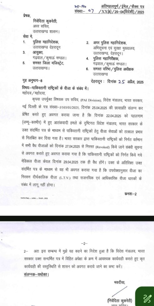 प्रदेश में पाकिस्तानी राष्ट्रिकों को जारी वीजा के संबंध में मुख्यमंत्री के निर्देशों एवं विदेश मंत्रालय भारत सरकार द्वारा जारी दिशा निर्देशों के क्रम में अपर सचिव गृह निवेदिता कुकरेती द्वारा पुलिस महानिदेशक, अपर पुलिस महानिदेशक अभिसूचना व सुरक्षा के साथ आयुक्त तथा पुलिस महानिरिक्षक गढ़वाल एवं कुमाऊं को प्रेषित पत्र में स्पष्ट किया है, कि विदेश मंत्रालय भारत सरकार द्वारा 22 अप्रैल को पहलगाम (जम्मू कश्मीर) में हुई आतंकवादी घटना के दृष्टिगत पाकिस्तानी नागरिकों के लिए जारी वीजा सेवाओं को तत्काल प्रभाव से निलंबित कर दिया गया है। उन्होंने इस संबंध में विदेश मंत्रालय के संदर्भित पत्र की अपेक्षा के क्रम में आवश्यक कार्यवाही करने को कहा है।