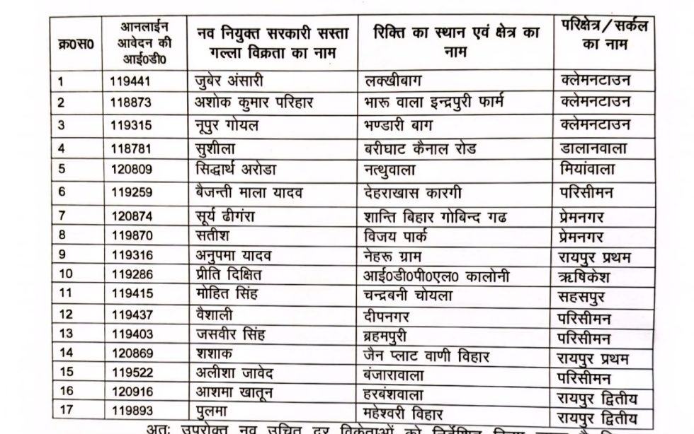 देहरादून। जिलाधिकारी सविन बंसल की पहल पर देहरादून में वर्षों बाद 17 नई सरकारी सस्ता गल्ला दुकानों का आवंटन किया गया है।
