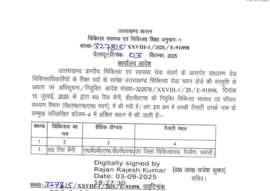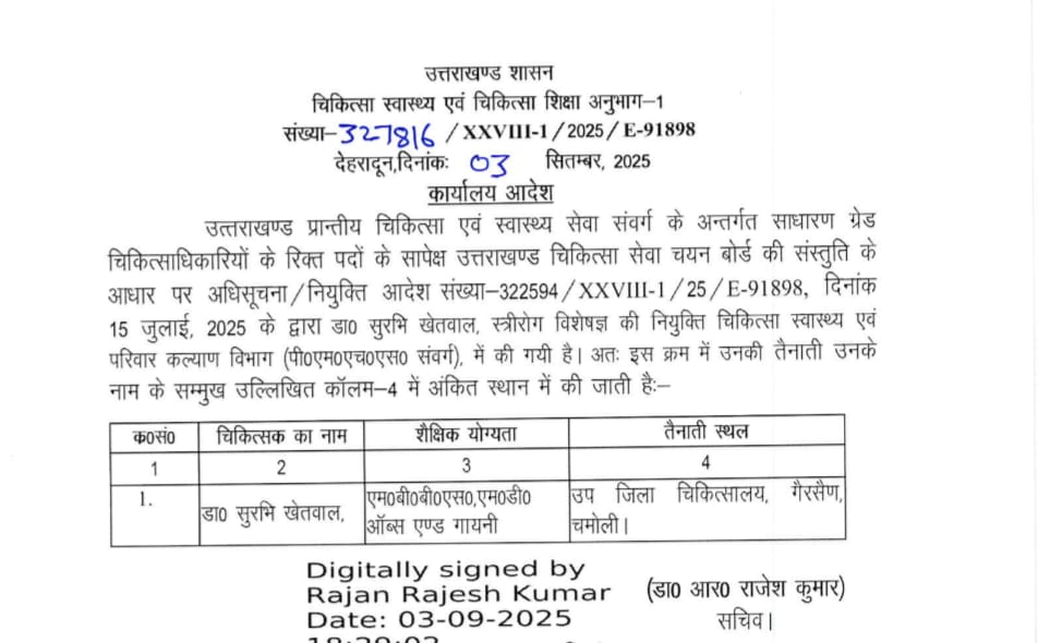 बुधवार को हुए आदेश में डॉ रिया सैनी और डॉ सुरभि खेतवाल को गैरसैंण के उप जिला चिकित्सालय में तैनात किया गया।