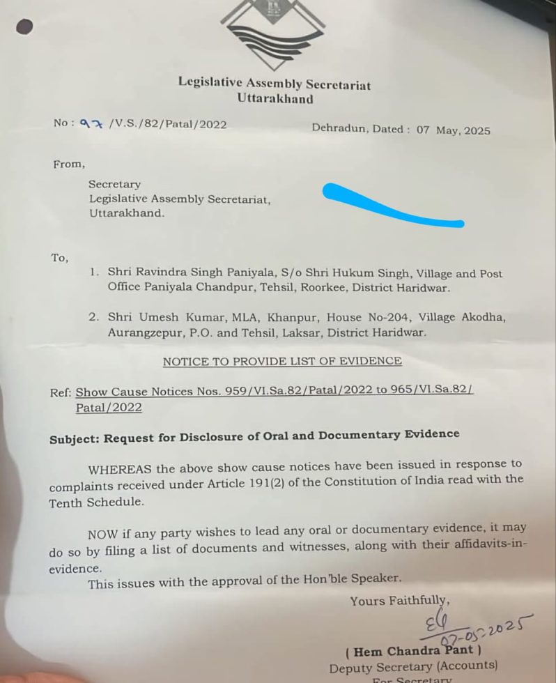 बहरहाल, विधानसभा के डिप्टी सेक्रेटरी हेम पंत ने स्पीकर ऋतु खण्डूड़ी के निर्देशों का हवाला देते हुए भाजपा नेता व याचिकाकर्ता रविन्द्र पनियाला व निर्दलीय विधायक को शपथ पत्र के साथ मौखिक व दस्तावेजी सबूत पेश करने को कहा है। विस सचिवालय ने यह पत्र अंग्रेजी में जारी किया है।