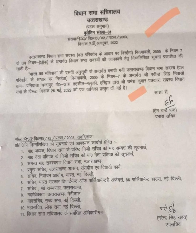 देहरादून। तीन साल पहले निर्दलीय विधायक उमेश कुमार के दल बदल से जुड़ी एक याचिका पर विधानसभा सचिवालय ने अब करवट ली है।