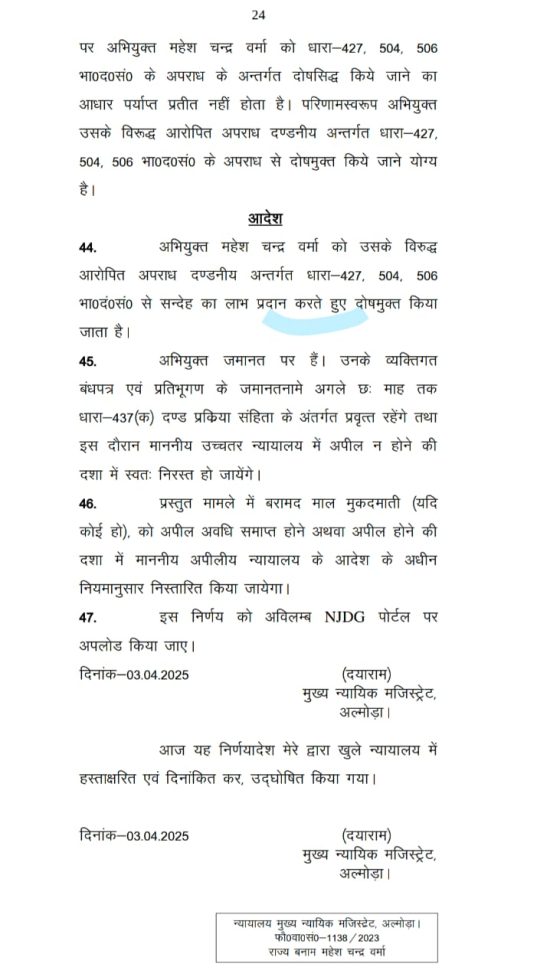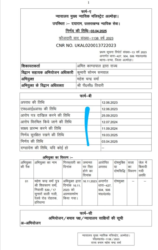 मुख्य न्यायिक मजिस्ट्रेट अल्मोड़ा दयाराम ने न्यायालय में पत्रावली में मौजूद दस्तावेजों, गवाहों के बयानों व दोनों पक्षों की बहस सुनने के बाद अभियुक्त महेश चंद्र वर्मा को दोष सिद्ध करने का पर्याप्त आधार न होने पर दोष मुक्त करने का आदेश दिया।