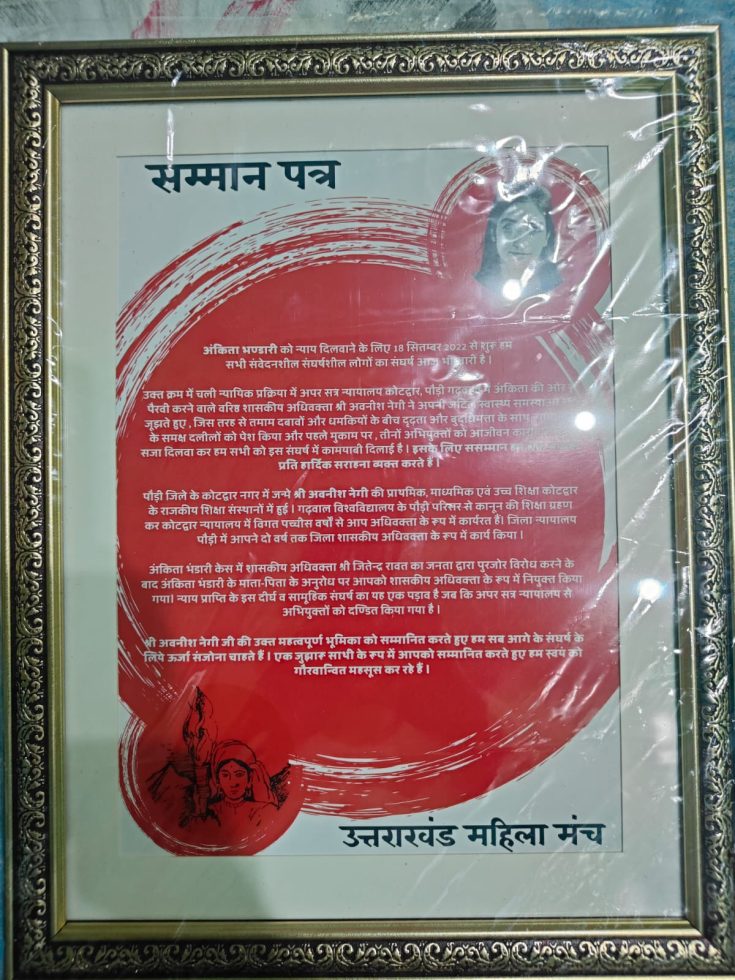 उत्तराखंड महिला मंच की ओर से दोनों अधिवक्ताओं को अंगवस्त्र भेंटकर सम्मानित किया गया। इस मौके पर अवनीश नेगी ने कहा कि यह मुकदमा उनके लिए एक कठिन परीक्षा थी। आरोपी वीआईपी थे और दूसरी तरफ से जनता का दबाव था। स्वास्थ्य ठीक न होने के बावजूद उन्होंने अंकिता और उसके मित्र पुष्पदीप के चैट के 5 हजार पेजों का अध्ययन किया। उनमें मुकदमे में काम आने वाले तथ्य तलाशे। पुलिस जांच की रिपोर्ट पढ़ी, तब कहीं जाकर तीनों आरोपियों को आजीवन कारावास की सजा दिलाने में सफलता मिल पाई। उन्होंने कहा कि इस मामले में जनता का दबाव एक वकील के रूप में उनके लिए बेहद महत्वपूर्ण और लगातार मेहनत करने के प्रोत्साहित करने वाला साबित हुआ।