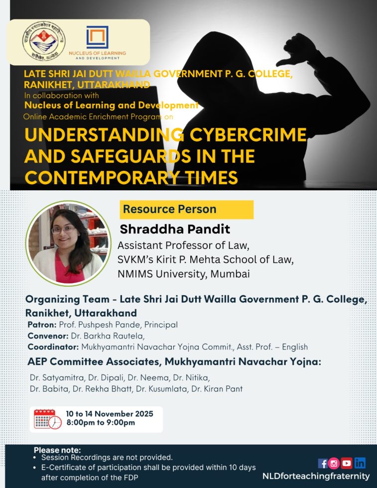 रानीखेत। स्वर्गीय जय दत्त वैल्ला राजकीय स्नातकोत्तर महाविद्यालय, रानीखेत (उत्तराखंड) में न्यूक्लियस ऑफ लर्निंग एंड डेवलपमेंट (एनएलडी), वडोदरा, गुजरात के सहयोग से आयोजित पांच दिवसीय ऑनलाइन एकेडमिक एनरिचमेंट प्रोग्राम (एईपी) ‘Understanding Cybercrime and Safeguards in the Contemporary Times’ का 14 नवंबर को सफल समापन हो गया।