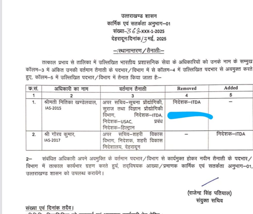 संयुक्त सचिव राजेन्द्र पत्याल की ओर से जारी आदेश में आइटीडीए की निदेशक आईएएस निकिता खंडेलवाल से हटाकर आईएएस गौरव कुमार को नया निदेशक बनाया गया है।