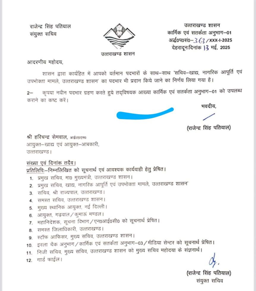 शासन द्वारा कार्यहित में आपको वर्तमान पदभारों के साथ-साथ ‘सचिव खाद्य, नागरिक आपूर्ति एवं उपभोक्ता मामले, उत्तराखण्ड शासन का पदभार भी प्रदान किये जाने का निर्णय लिया गया है।