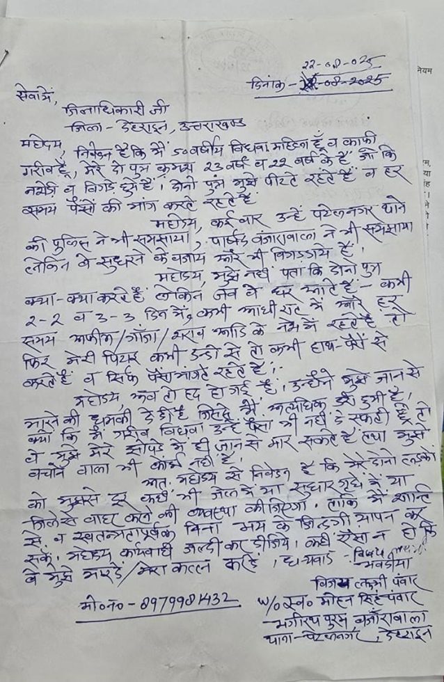 देहरादून। भागीरथपुरम, बंजारावाला निवासी विधवा विजयलक्ष्मी पंवार ने अपने दो बिगड़ैल बेटों से परेशान होकर जिलाधिकारी सविन बंसल से गुहार लगाई।