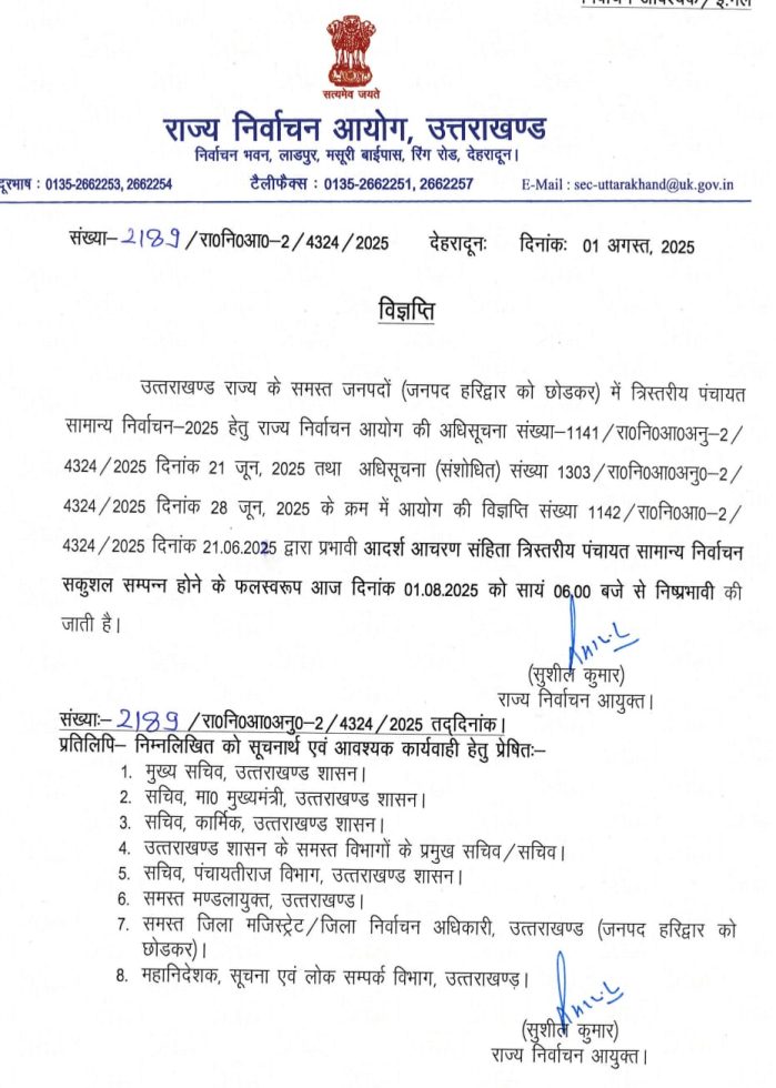 इस बीच, त्रिस्तरीय पंचायत सामान्य निर्वाचन–2025 के सफल समापन के बाद राज्य निर्वाचन आयोग ने आदर्श आचार संहिता को आज 01 अगस्त 2025 की सायं 6:00 बजे से समाप्त घोषित कर दिया है। आयोग ने 21 जून और 28 जून 2025 की अधिसूचनाओं के क्रम में पंचायत चुनाव सम्पन्न कराए थे। चुनाव प्रक्रिया शांतिपूर्ण रही और मतदान के साथ ही परिणामों की घोषणा भी तय कार्यक्रम के अनुसार सम्पन्न हुई।