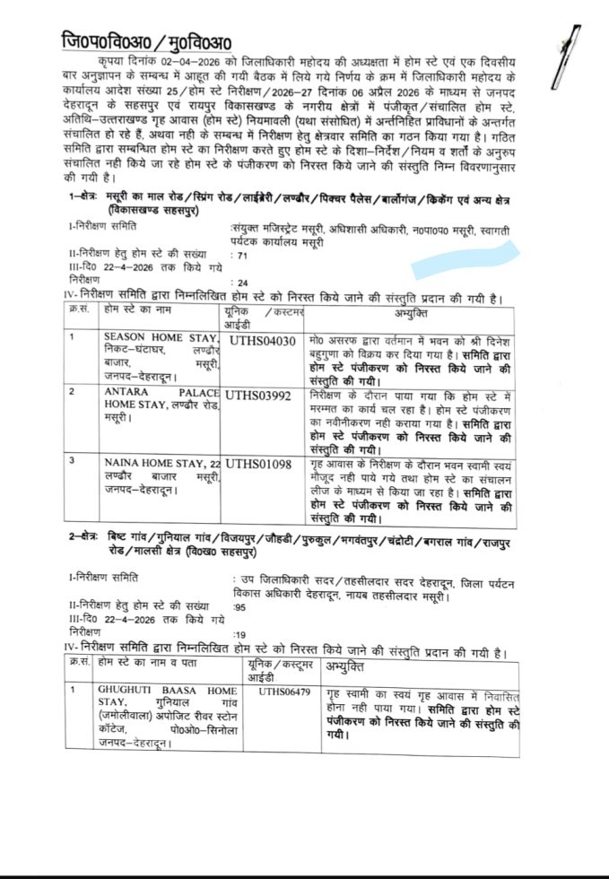 जांच में मानकों का उल्लंघन पाए जाने पर जिला प्रशासन ने बड़ी कार्रवाई करते हुए प्रथम चरण में 17 होमस्टे का पंजीकरण निरस्त कर दिया है। संबंधित होमस्टे को विभागीय वेबसाइट से भी हटाने की प्रक्रिया शुरू कर दी गई है।