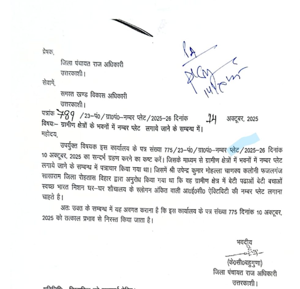 पत्रांक 789/23-पं० / ग्रा०पं०-नम्बर प्लेट/2025-26 दिनांक विषयः- ग्रामीण क्षेत्रों के भवनों में नम्बर प्लेट लगाये जाने के सम्बन्ध में।