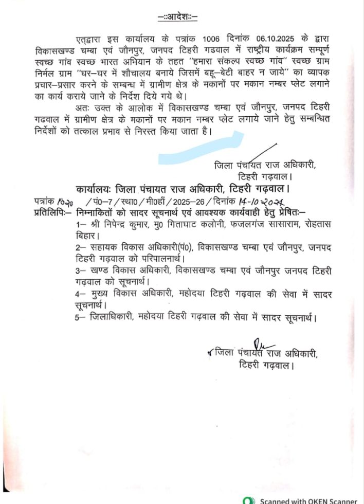एतद्वारा इस कार्यालय के पत्रांक 1006 दिनांक 06.10.2025 के द्वारा विकासखण्ड चम्बा एवं जौनपुर, जनपद टिहरी गढवाल में राष्ट्रीय कार्यक्रम सम्पूर्ण स्वच्छ गांव स्वच्छ भारत अभियान के तहत “हमारा संकल्प स्वच्छ गांव” स्वच्छ ग्राम निर्मल ग्राम “घर-घर में शौचालय बनाये जिसमें बहू-बेटी बाहर न जाये” का व्यापक प्रचार-प्रसार करने के सम्बन्ध में ग्रामीण क्षेत्र के मकानों पर मकान नम्बर प्लेट लगाने का कार्य कराये जाने के निर्देश दिये गये थे।