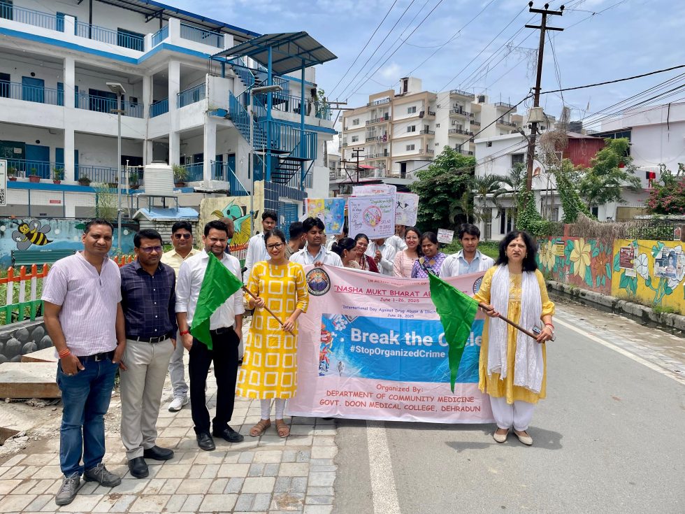 देहरादून। राजकीय दून मेडिकल कॉलेज के कम्युनिटी मेडिसिन विभाग द्वारा अंतरराष्ट्रीय मादक द्रव्य निषेध दिवस-2025 के अवसर पर नशा मुक्त भारत अभियान का आयोजन किया गया। 1 जून से 26 जून 2025 तक चले इस अभियान में जागरूकता कार्यक्रमों की श्रृंखला के माध्यम से युवाओं व आमजन को नशे के दुष्प्रभावों से सचेत किया गया।