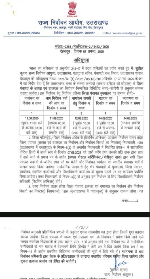 भारत का संविधान के अनुच्छेद 243-ट में प्रदत्त शक्तियों का प्रयोग करते हुए मैं, सुशील कुमार, राज्य निर्वाचन आयुक्त, उत्तराखण्ड, एतद्वारा सचिव, पंचायती राज विभाग, उत्तराखण्ड शासन, देहरादून की अधिसूचना संख्या-1126/XII (1)/2025/86(16)/2019 दिनांक 07 अगस्त, 2025 के क्रम में यह निर्देश देता हूँ कि उत्तराखण्ड राज्य के समस्त जनपदों (जनपद हरिद्वार को छोड़कर) के जिला पंचायत के अध्यक्ष एवं उपाध्यक्ष का निर्वाचन निम्नांकित विनिर्दिष्ट समय सारिणी के अनुसार सम्पन्न कराया जायेगा। इस निर्वाचन हेतु निर्वाचन प्रक्रिया जिला पंचायत मुख्यालय पर सम्पन्न होगीः-