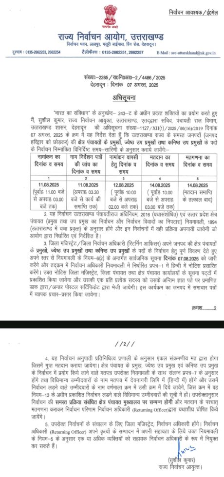 भारत का संविधान” के अनुच्छेद 243-ट के अधीन प्रदत्त शक्तियों का प्रयोग करते हुए मैं, सुशील कुमार, राज्य निर्वाचन आयुक्त, उत्तराखण्ड, एतद्वारा सचिव, पंचायती राज विभाग, उत्तराखण्ड शासन, देहरादून की अधिसूचना संख्या-1127/XII (1)/2025/86(16)/2019 दिनांक 07 अगस्त, 2025 के क्रम में यह निर्देश देता हूँ कि उत्तराखण्ड राज्य के समस्त जनपदों (जनपद हरिद्वार को छोड़कर) की क्षेत्र पंचायतों के प्रमुखों, ज्येष्ठ उप प्रमुखों तथा कनिष्ठ उप प्रमुखों के पदों के निर्वाचन निम्नांकित विनिर्दिष्ट समय सारिणी के अनुसार कराये जायेंगेः-