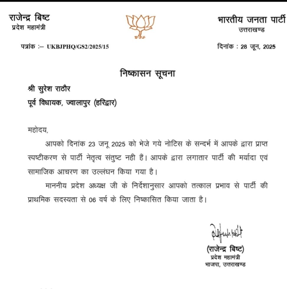 भाजपा नेतृत्व ने राठौर को पहले ही 23 जून को नोटिस जारी किया था, लेकिन स्पष्टीकरण अस्वीकार्य मानते हुए शनिवार को उन्हें पार्टी से निष्कासित कर दिया गया। पार्टी ने अपने पत्र में लिखा कि राठौर का व्यवहार “पार्टी की मर्यादा और सामाजिक आचरण के प्रतिकूल” है।