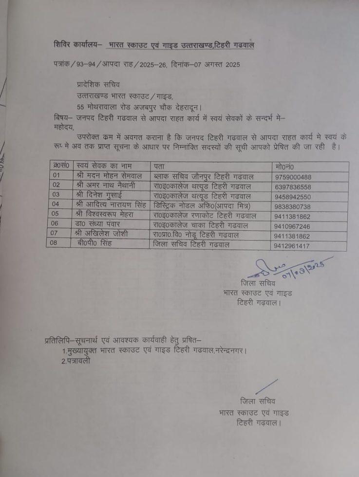 टिहरी गढ़वाल। भारत स्काउट एवं गाइड, उत्तराखंड के टिहरी गढ़वाल शिविर कार्यालय ने हालिया आपदा के मद्देनज़र राहत एवं बचाव कार्यों में सहयोग के लिए स्वयंसेवकों की सूची जारी की है। शिविर कार्यालय ने बताया कि आपदा के समय ये प्रशिक्षित स्वयंसेवक विभिन्न क्षेत्रों में सक्रिय रहेंगे और स्थानीय प्रशासन का सहयोग करेंगे।