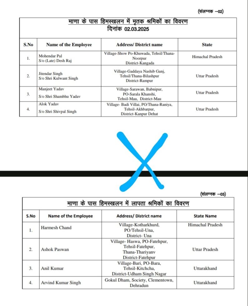 बदरीनाथ/माणा से सभी 50 श्रमिकों (46 सुरक्षित तथा 04 मृतक) को ज्योतिर्मठ लाया जा चुका है। मृतक श्रमिकों का पोस्टमार्टम कराये जाने की कार्यवाही गतिमान है, जिसके बाद उनके शवों को उनके घर भेजा जाएगा। मुख्यमंत्री जी के निर्देशन में आपदा प्रबंधन विभाग द्वारा सभी के साथ समुचित समन्वय किया जा रहा है।