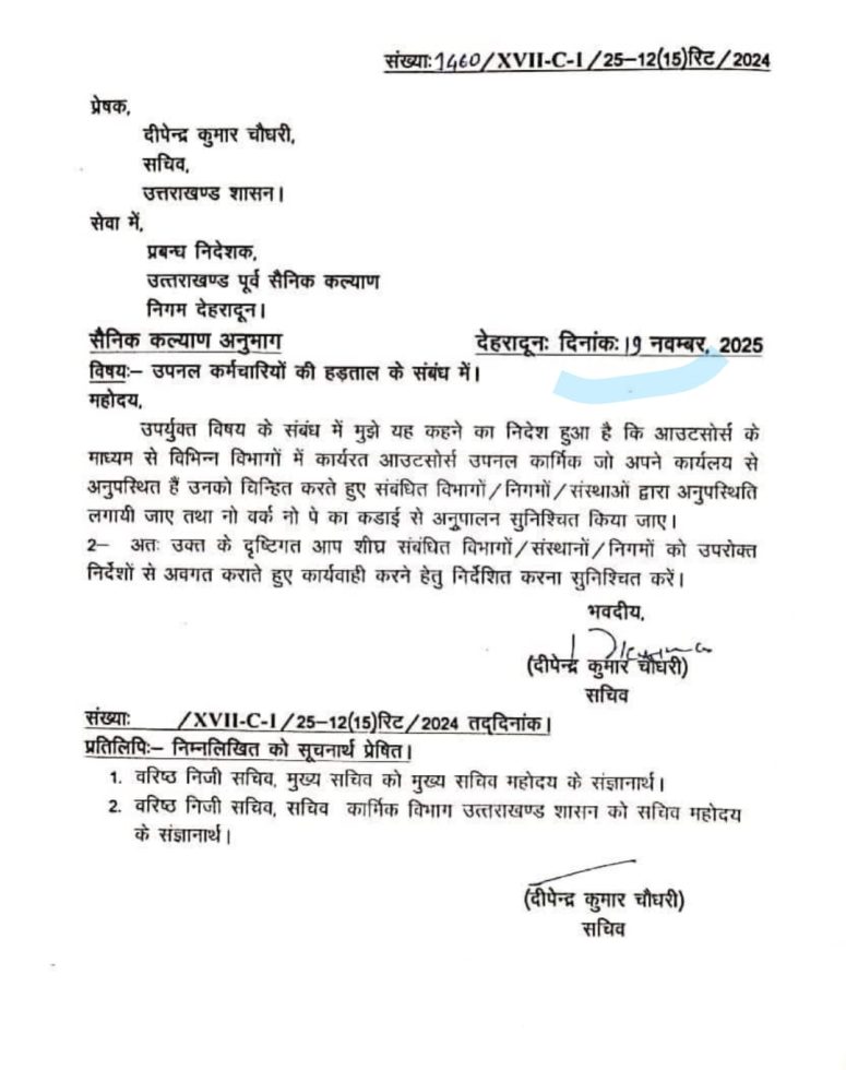 सैनिक कल्याण अनुभाग की ओर से जारी पहले आदेश में कहा गया है कि विभिन्न विभागों, निगमों और संस्थानों में आउटसोर्स के माध्यम से कार्यरत उपनल कार्मिक यदि अपने कार्यस्थल से अनुपस्थित पाए जाते हैं, तो उनकी तुरंत पहचान कर अनुपस्थिति दर्ज की जाए तथा नो वर्क–नो पे नीति का कड़ाई से पालन किया जाए।