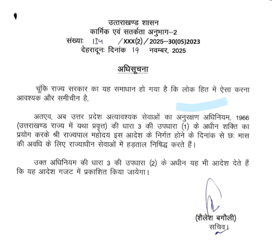 इसी क्रम में, राज्य सरकार ने जनहित में सेवाओं के संचालन को सुचारू बनाए रखने के उद्देश्य से बड़ा निर्णय लेते हुए उत्तर प्रदेश अत्यावश्यक सेवाओं का अनुरक्षण अधिनियम, 1966 (उत्तराखंड राज्य में यथाप्रवृत्त) की धारा 3(1) के अंतर्गत राज्याधीन सेवाओं में हड़ताल को छह माह के लिए प्रतिबंधित कर दिया है।