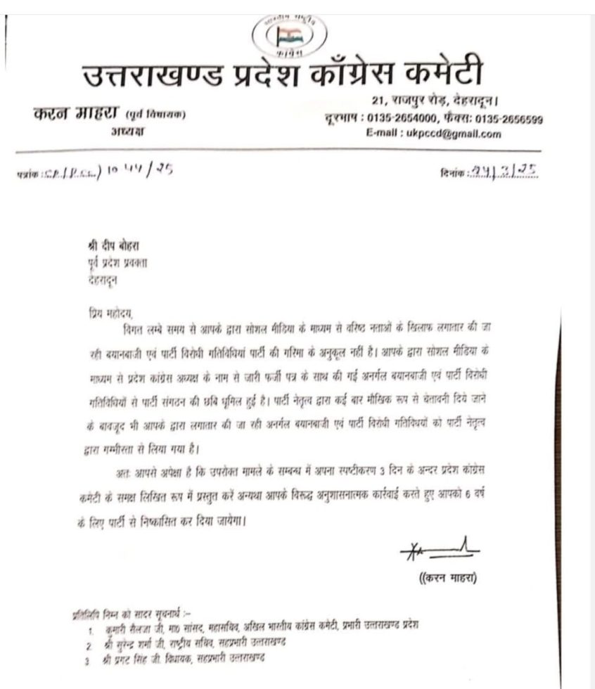 देहरादून। उत्तराखंड प्रदेश कांग्रेस कमेटी के पूर्व प्रवक्ता दीप वोहरा को पार्टी ने अनुशासनहीनता के आरोप में कारण बताओ नोटिस जारी किया है।