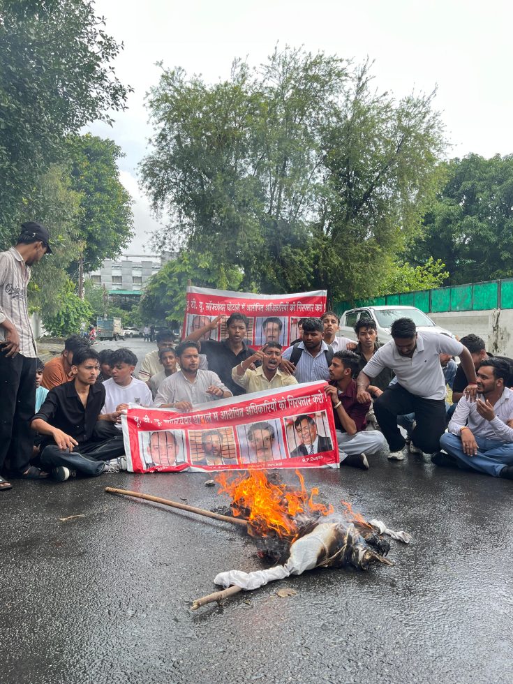 छात्रसंघ अध्यक्ष सिद्धार्थ अग्रवाल के नेतृत्व में छात्रों ने विभागीय मंत्री सुबोध उनियाल के आवास के बाहर प्रदर्शन करते हुए कुलपति ओंकार सिंह यादव का पुतला फूंका।