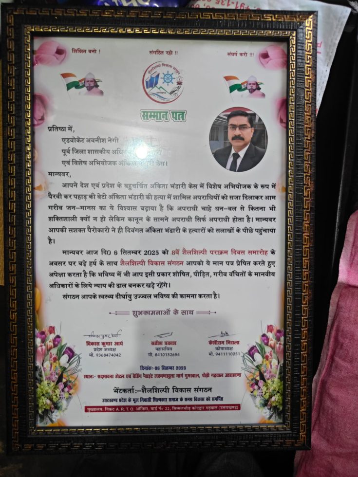 इस अवसर पर पर्यावरणविद डॉ. त्रिलोक चंद सोनी को संगठन का सर्वोच्च सम्मान “शैलशिल्पी कर्मवीर जयानंद भारतीय सम्मान 2025” प्रदान किया गया। साथ ही अंकिता भंडारी प्रकरण के विशेष अभियोजक एडवोकेट अवनीश नेगी को भी अंगवस्त्र और मानपत्र देकर सम्मानित किया गया।