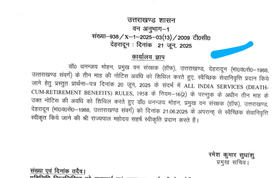 डॉ० धनन्जय मोहन, प्रमुख वन संरक्षक (हॉफ), उत्तराखण्ड, देहरादून (भा०व०से0-1988, उत्तराखण्ड संवर्ग) के तीन माह की नोटिस अवधि को शिथिल करते हुए, स्वैच्छिक सेवानिवृत्ति प्रदान किये जाने हेतु प्रस्तुत प्रार्थना-पत्र दिनांक 20 जून, 2025 के संदर्भ में ALL INDIA SERVICES (DEATH-CUM-RETIREMENT BENEFITS) RULES, 1958 के नियम-16 (2) के परन्तुक के अधीन तीन माह के उक्त नोटिस की अवधि को शिथिल करते हुए डॉ० धनन्जय मोहन, प्रमुख वन संरक्षक (हॉफ), उत्तराखण्ड, देहरादून (भा०व०से0-1988, उत्तराखण्ड संवर्ग) को दिनांक 21.06.2025 के अपरान्ह से स्वैच्छिक सेवानिवृत्ति स्वीकृत किये जाने की श्री राज्यपाल महोदय सहर्ष स्वीकृति प्रदान करते हैं।