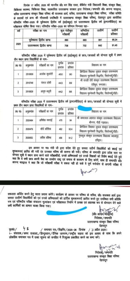 देहरादून। विद्यालयी शिक्षा मंत्री धन सिंह रावत ने उत्तराखण्ड संस्कृत शिक्षा परिषद् द्वारा आयोजित परिषदीय परीक्षा-2025 के पूर्वमध्यमा द्वितीय वर्ष (हाईस्कूल) एवं उत्तरमध्यमा द्वितीय वर्ष (इण्टरमीडिएट) का परीक्षाफल घोषित किया गया।