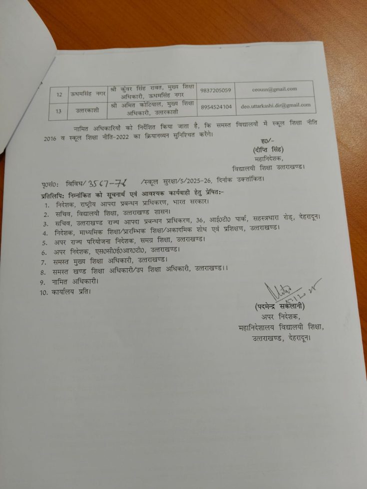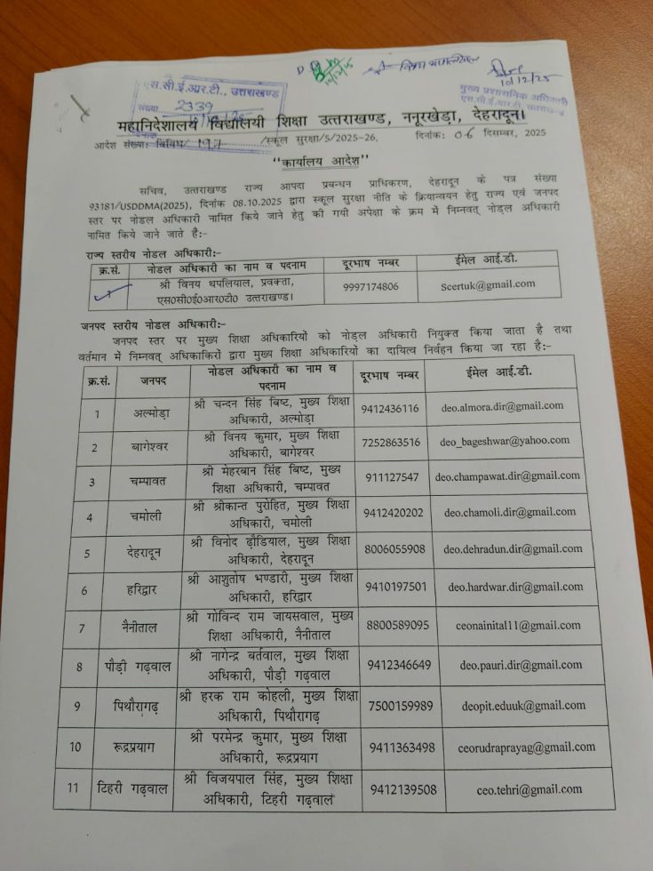 देहरादून। स्कूल सुरक्षा नीति के प्रभावी क्रियान्वयन के लिए राज्य स्तर पर विनय थपलियाल तथा जनपद स्तर पर सभी मुख्य शिक्षा अधिकारियों को नोडल अधिकारी नामित किया गया है। वर्ष 2025 की स्कूल सुरक्षा नीति का उद्देश्य स्कूलों में सुरक्षा की संस्कृति विकसित करना, आपदा जोखिम को कम करना और विद्यार्थियों की समग्र सुरक्षा सुनिश्चित करना है।