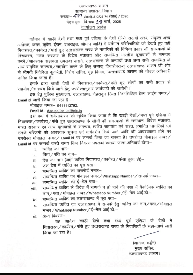 यह आदेश खाड़ी देशों एवं मध्य पूर्व एशिया में रह रहे उत्तराखंड के नागरिकों को त्वरित सहायता, राहत और मार्गदर्शन उपलब्ध कराने के उद्देश्य से जारी किया गया है।