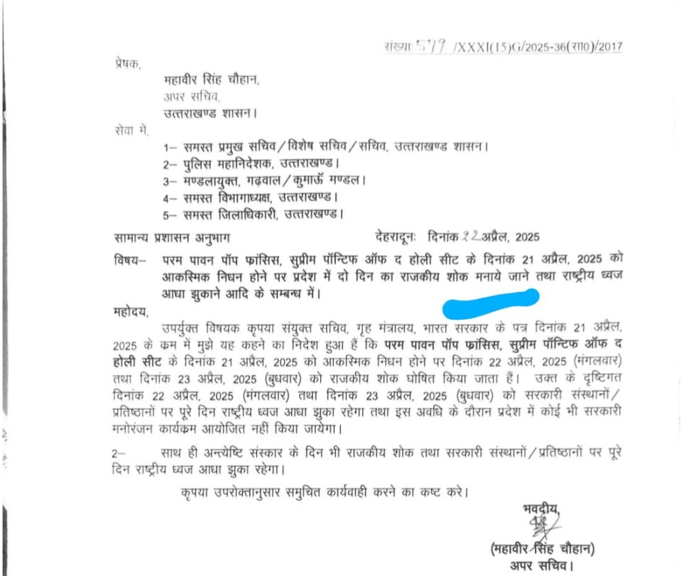 विषय- परम पावन पॉप फ्रांसिस, सुप्रीम पॉन्टिफ ऑफ द होली सीट के दिनांक 21 अप्रैल, 2025 को आकस्मिक निधन होने पर प्रदेश में दो दिन का राजकीय शोक मनाये जाने तथा राष्ट्रीय ध्वज आधा झुकाने आदि के सम्बन्ध में।