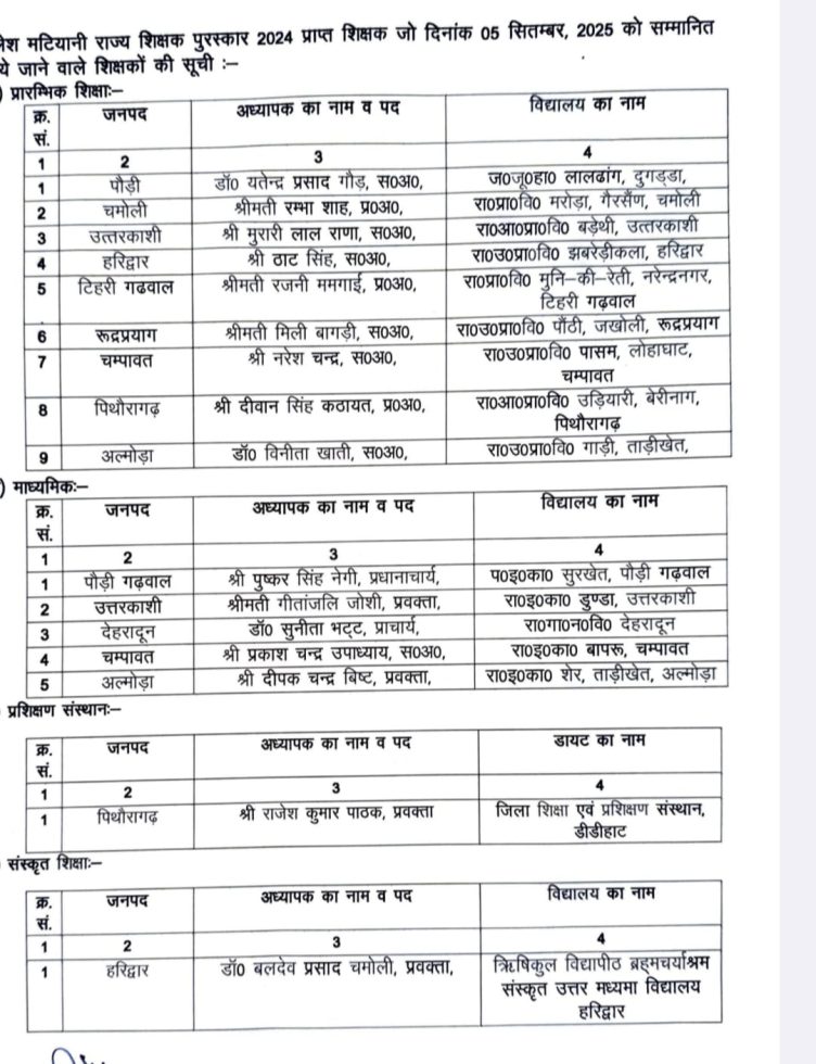 समारोह में राज्यपाल लेफ्टिनेंट जनरल गुरमीत सिंह (से नि), मुख्यमंत्री पुष्कर सिंह धामी और शिक्षा मंत्री डॉ. धन सिंह रावत ने वर्ष-2024 में शैलेश मटियानी राज्य शैक्षिक पुरस्कारों के लिए चयनित 16 शिक्षक एवं शिक्षिकाओं को सम्मानित किया। वर्ष-2024 में चयनित 09 प्रारम्भिक शिक्षक, 05 माध्यमिक शिक्षक, 01 शिक्षक प्रशिक्षक एवं 01 संस्कृत शिक्षक को यह सम्मान प्रदान किया गया है। (सूची संलग्न)