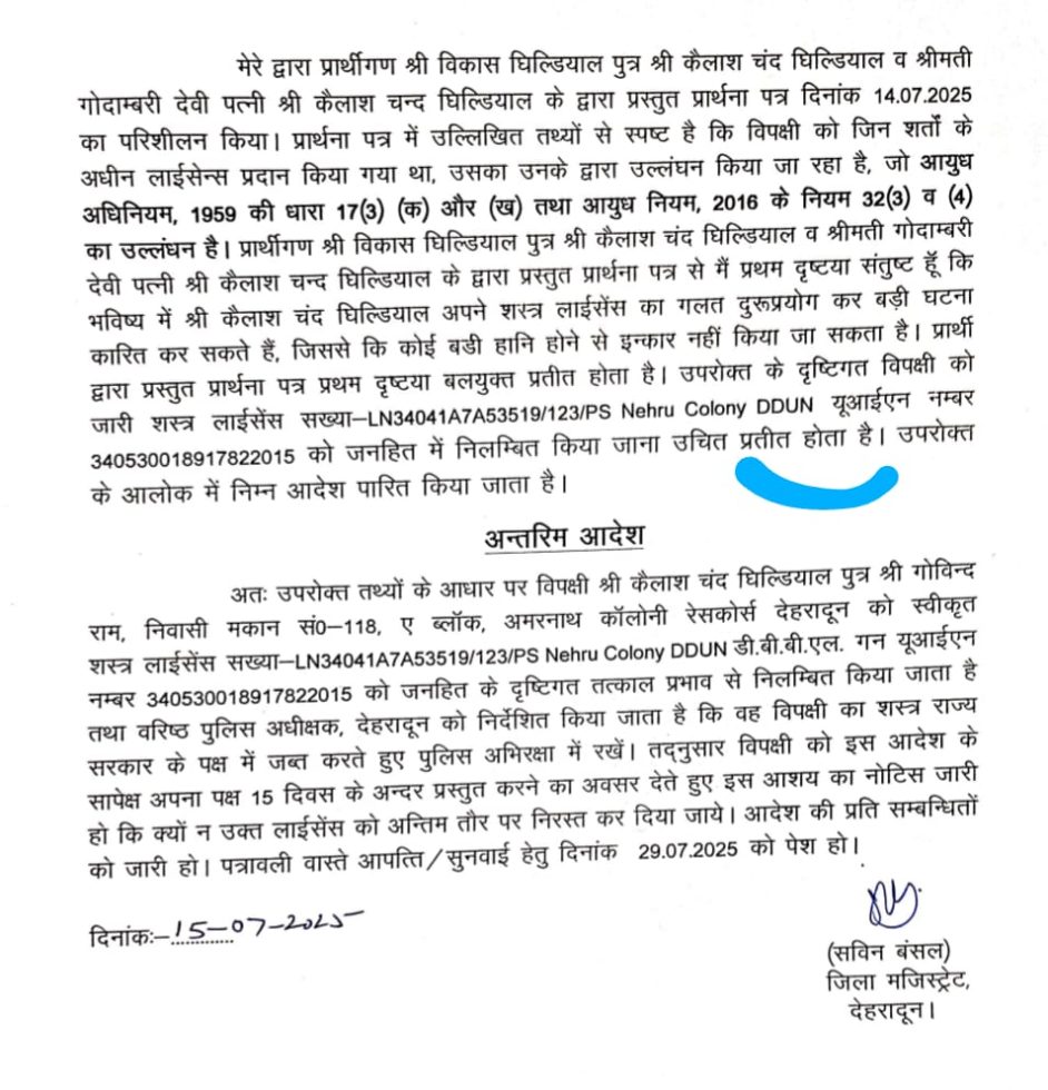 देहरादून। जिलाधिकारी सविन बंसल ने पत्नी और बेटे के लिए खतरा बने एक आईटीबीपी इंस्पेक्टर का शस्त्र लाइसेंस तत्काल प्रभाव से निलंबित कर दिया है। साथ ही एसएसपी को निर्देश दिए गए हैं कि आरोपी के खिलाफ मुकदमा दर्ज कर उसका शस्त्र थाने में जमा कराया जाए।
