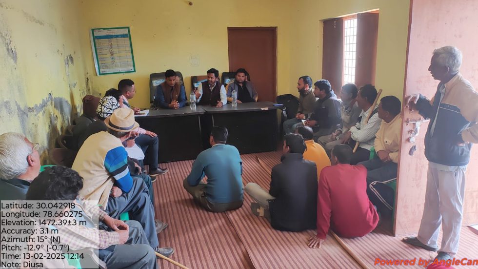 पौड़ी। जिलाधिकारी गढ़वाल के द्वारा लिए गए निर्देशों के परिपालन में विकास खंड कल्जीखाल के राजस्व ग्राम दिऊसा में सरकार जनता के द्वार कार्यक्रम में विभिन्न विभागों से आए कर्मचारियों द्वारा चौपाल लगाकर ग्रामीणों की समस्याएं सुनी गई जिसमें नोडल अधिकारी अधिशासी अभियंता लघु सिंचाई विभाग पौड़ी को नामित किया गया था । जिनकी उपस्थिति में चौपाल का कार्यक्रम आयोजित किया गया।