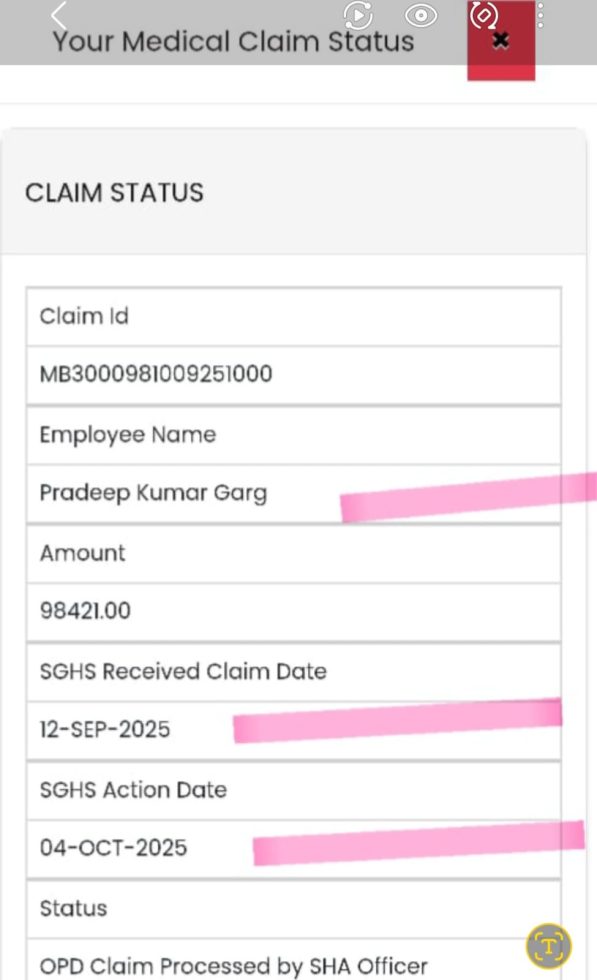 राज्य स्वास्थ्य प्राधिकरण के पोर्टल के अनुसार प्रदीप कुमार गर्ग का क्लेम 12 सितंबर 2025 को प्राप्त हुआ था और 4 अक्टूबर 2025 को प्रक्रिया पूरी कर दी गई। बावजूद आज तक भुगतान नहीं हुआ। ‘क्लेम प्रोसेस्डÓ होने के बाद भी राशि न मिलना व्यवस्था की गंभीर खामी को उजागर करता है।