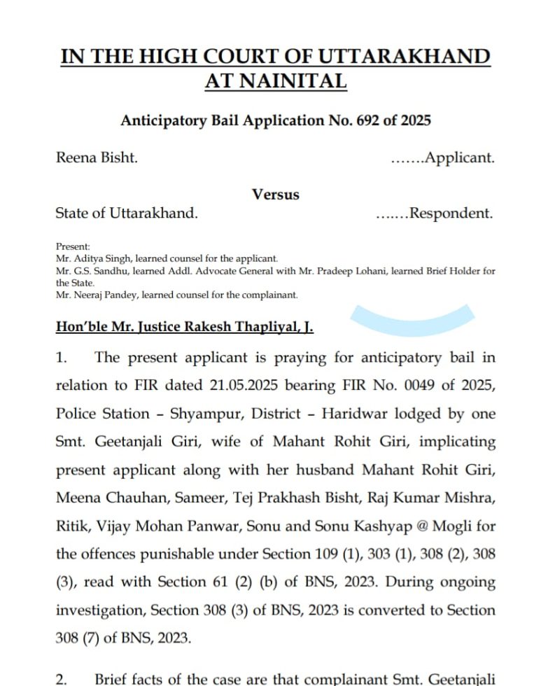 आरोपित की अग्रिम जमानत याचिका की सुनवाई के दौरान पारित किया गया था। रिसीवर नियुक्त करने सम्बन्धी यह आदेश हाईकोर्ट के जज राकेश थपलियाल ने 25 जून को दिया था।