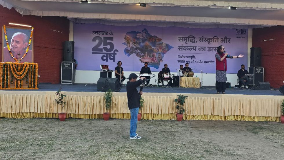 कार्यक्रम की अगली कड़ी में दोपहर बाद उत्तराखंड के प्रसिद्ध लोकगायक दर्शन फर्स्वाण और स्वाति भट्ट द्वारा सांस्कृतिक प्रस्तुतियां दी गईं। उनके प्रस्तुत किए गए लोकगीतों और झोड़े-छपेली की मनमोहक धुनों पर छात्र-छात्राएं झूम उठे। विश्वविद्यालय परिसर में उत्तराखंडी संस्कृति की झलक ने सभी को भावविभोर कर दिया।