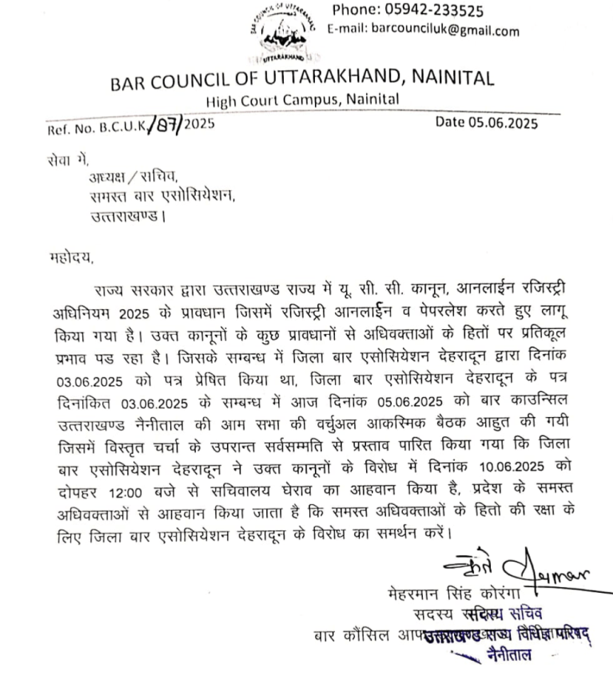 इस संबंध में जिला बार एसोसिएशन देहरादून द्वारा दिनांक 03 जून 2025 को राज्य सरकार को पत्र भेजा गया था, जिसमें कानून के आपत्तिजनक प्रावधानों पर पुनर्विचार करने की मांग की गई थी।