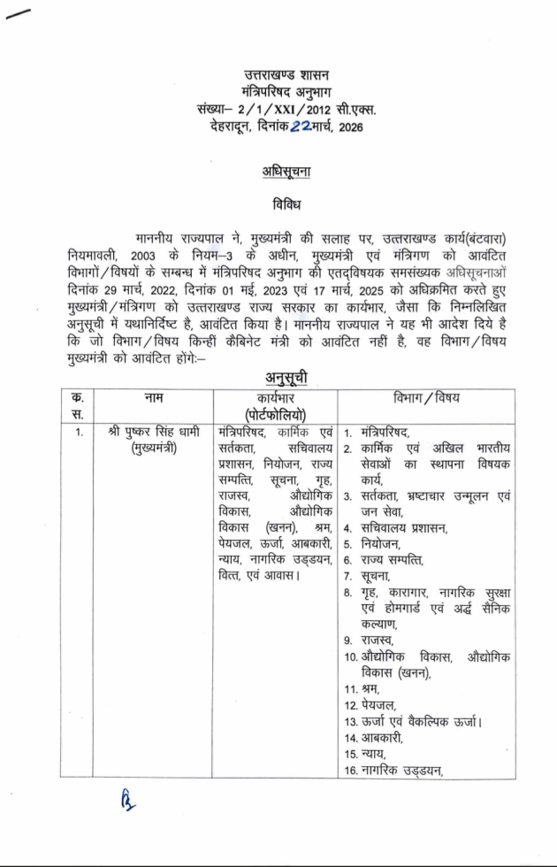 धामी खुद देखेंगे सामान्य प्रशासन, गृह, कार्मिक, नियुक्ति एवं प्रशिक्षण सूचना एवं जनसंपर्क विभाग