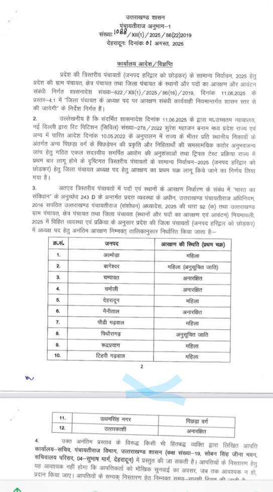 जिला पंचायत अध्यक्ष पदों के लिए आरक्षण का प्रथम चक्र लागू