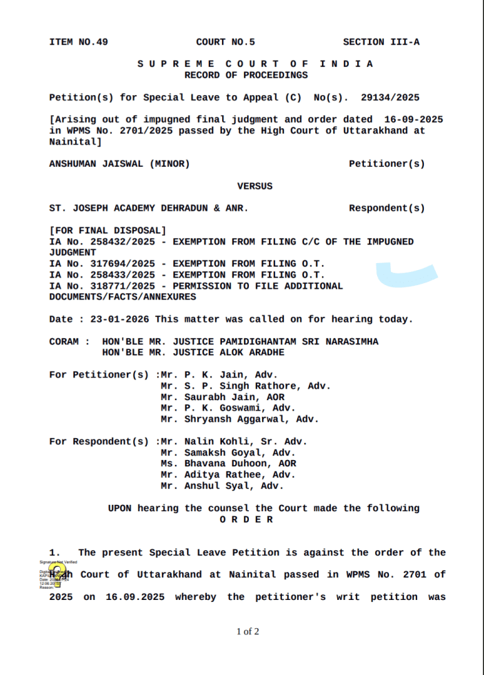 हालांकि, विगत 23 जनवरी को विशेष अनुमति याचिका को पूरी तरह से निस्तारित करते हुए अदालत ने अपने आदेश में कहा कि कक्षा 11वीं की अंतिम परीक्षा में छात्र अंशुमान जायसवाल को शामिल किया जाय। जिसके परीक्षा परिणाम में प्रदर्शन के आधार पर, सम्बन्धित जिलाधिकारी देहरादून से विमर्श के बाद इस मामले में अंतिम निर्णय लिया जाये।
