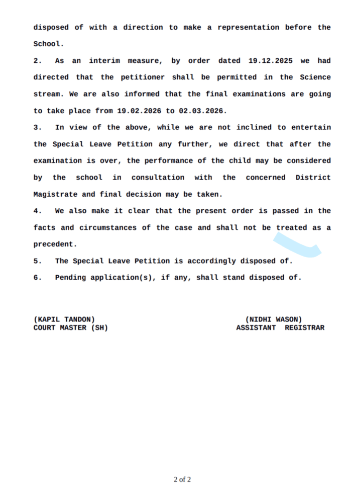 हाईकोर्ट के आदेश को छात्र की ओर से अंततः उच्चतम न्यायालय में विशेष अपील के माध्यम से चुनौती दी गयी। खंडपीठ ने 19 दिसंबर को अंतरिम राहत देते हुए अपीलकर्ता को विज्ञान स्ट्रीम मेें प्रवेश की अनुमति दे दी।