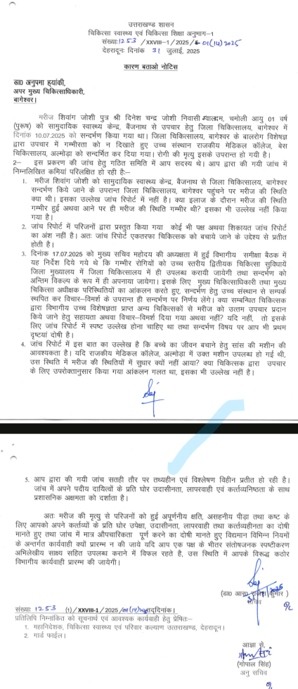 उपर्युक्त विषयक आपका ध्यान आकृष्ट करते हुए अवगत कराना है कि दिनांक 10.07.2025 को मरीज शिवांग जोशी पुत्र श्री दिनेश चन्द्र जोशी निवासी ग्वालदम, चमोली आयु 01 वर्ष (पुरूष) को सामुदायिक स्वास्थ्य केन्द्र, बैंजनाथ से उपचार हेतु जिला चिकित्सालय, बागेश्वर को सन्दर्भण किया गया था। जिला चिकित्सालय, बागेश्वर के बालरोग विशेषज्ञ द्वारा उपचार में गम्भीरता को न दिखाते हुए उच्च संस्थान राजकीय मेडिकल कॉलेज, बेस चिकित्सालय, अल्मोड़ा को सन्दर्भित कर दिया गया। रोगी की मृत्यु इसके उपरान्त हो गयी है।