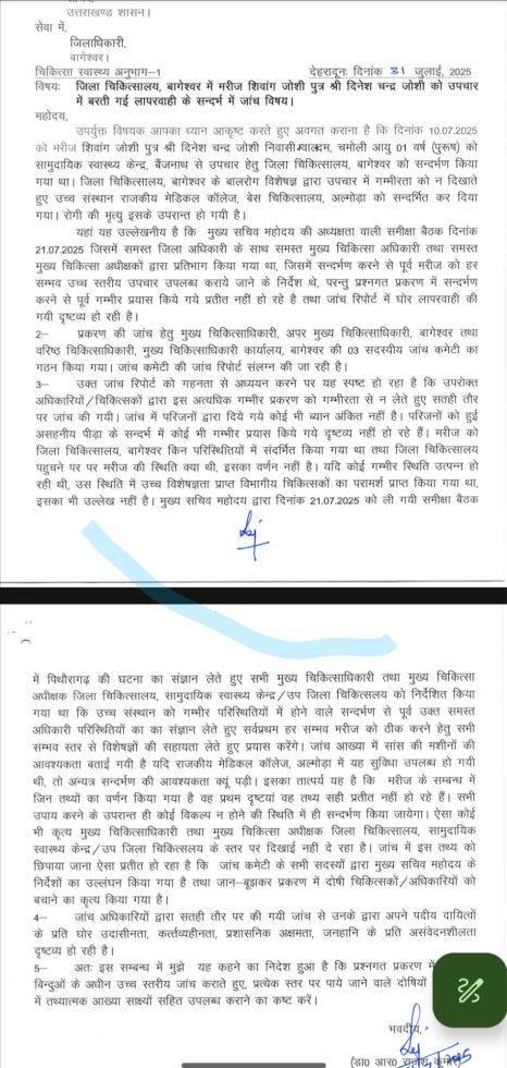 मुख्यमंत्री के निर्देशों के अनुपालन में स्वास्थ्य सचिव डॉ. आर. राजेश कुमार द्वारा इस प्रकरण की प्रारंभिक रिपोर्ट की समीक्षा के उपरांत यह पाया गया कि उपचार की गंभीरता अपेक्षित स्तर पर नहीं रही तथा रेफरल प्रक्रिया में स्पष्ट चिकित्सकीय आधार का अभाव रहा। सचिव ने इस मामले को अत्यंत संवेदनशील मानते हुए अब इसकी जांच जनपद बागेश्वर के जिलाधिकारी को सौंप दी है इस संबंध में सचिव द्वारा जिलाधिकारी को पत्र प्रेषित कर निर्देशित किया गया है कि वे पूरे घटनाक्रम में दोनों पक्षों की बात सुनकर तथ्यों का सम्यक परीक्षण करें और जांच रिपोर्ट शासन को प्रेषित करें। यह सुनिश्चित किया जाएगा कि जांच निष्पक्ष, पारदर्शी और समयबद्ध हो।