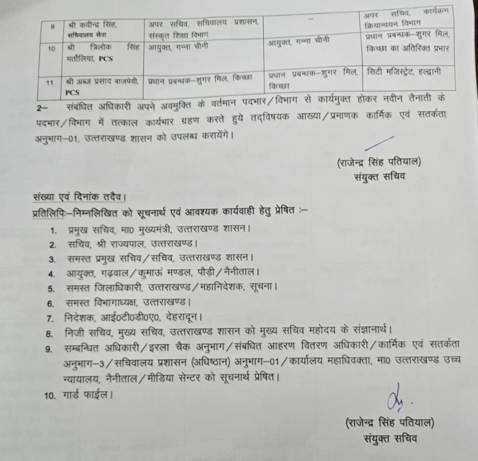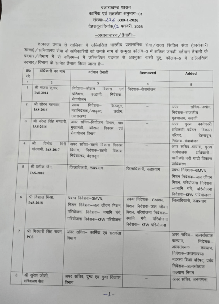 उत्तराखंड शासन के कार्मिक एवं सतर्कता अनुभाग-01 द्वारा जारी आदेश के तहत राज्य में व्यापक प्रशासनिक फेरबदल किया गया है। भारतीय प्रशासनिक सेवा (IAS) एवं राज्य सिविल सेवा (PCS) के कई अधिकारियों को तत्काल प्रभाव से उनके वर्तमान दायित्वों से मुक्त करते हुए नई तैनाती दी गई है।
