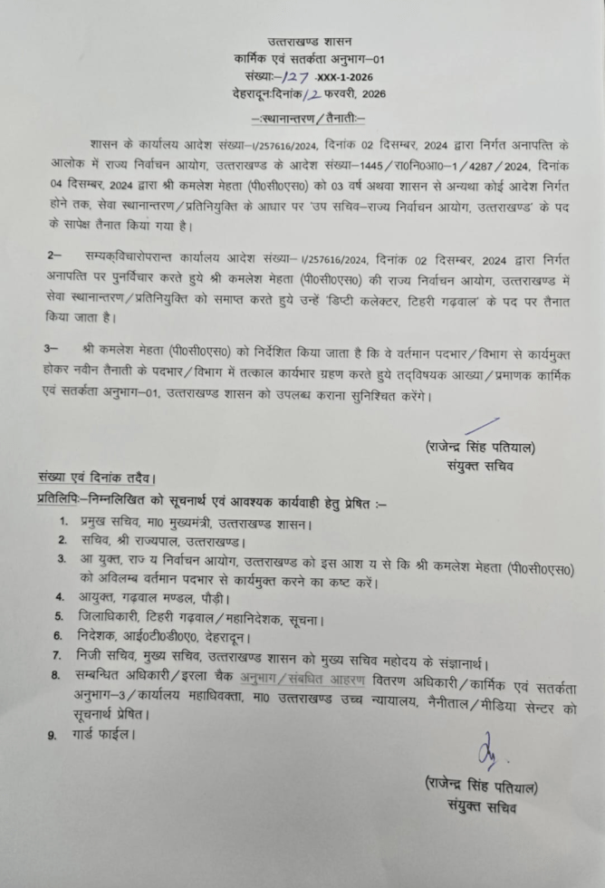 2-सम्यविचारोपरान्त कार्यालय आदेश संख्या- 1/257616/2024, दिनांक 02 दिसम्बर, 2024 द्वारा निर्गत अनापत्ति पर पुनर्विचार करते हुये श्री कमलेश मेहता (पी०सी०एस०) की राज्य निर्वाचन आयोग, उत्तराखण्ड में सेवा स्थानान्तरण / प्रतिनियुक्ति को समाप्त करते हुये उन्हें ‘डिप्टी कलेक्टर, टिहरी गढ़वाल’ के पद पर तैनात किया जाता है।
